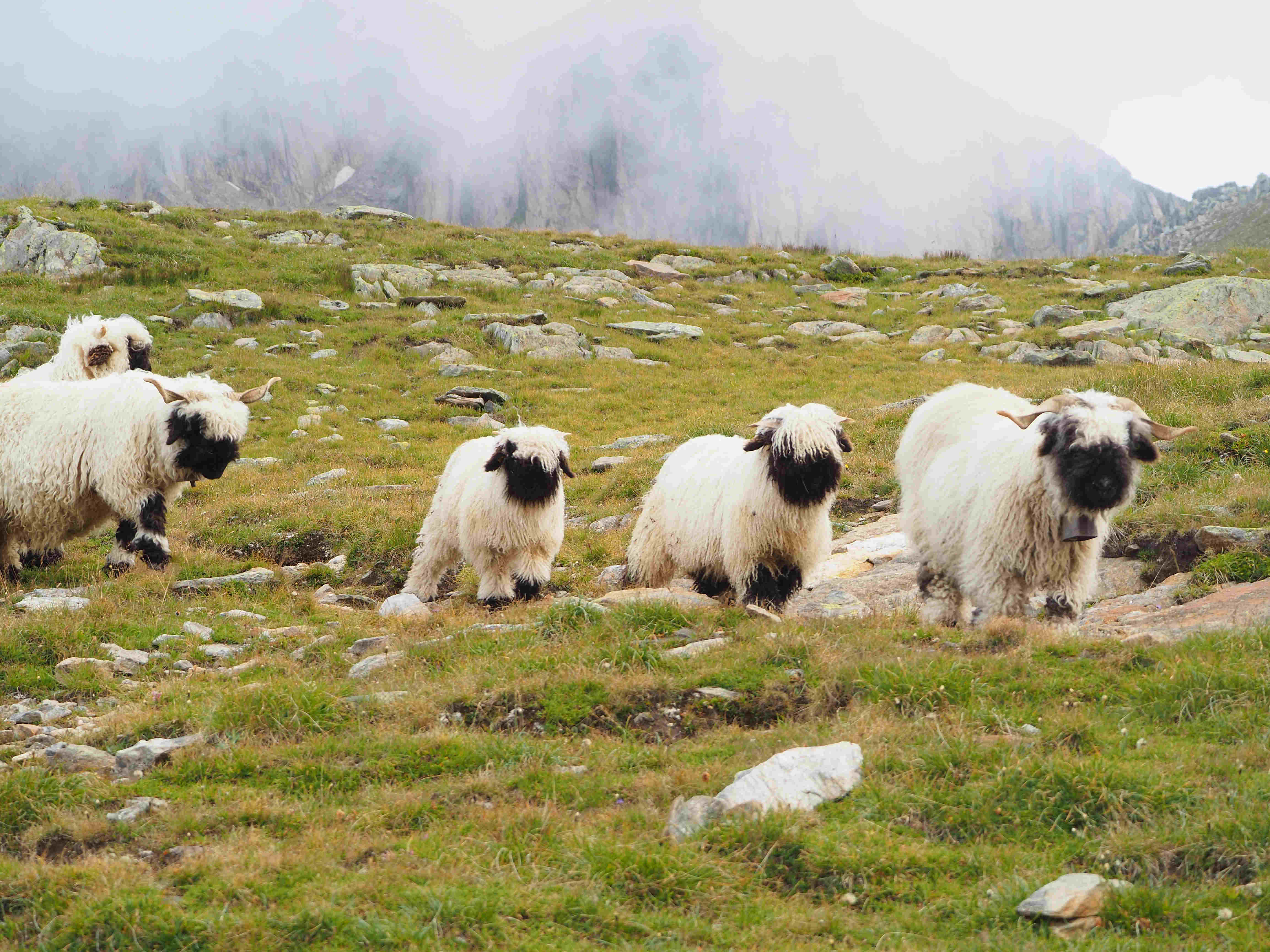 Continuant en prenant le tunnel de San Bernardino, nous nous retrouvons sur une grande route, direction Airolo. Là, la foule des vacances, les caravanes et les camping-cars, sur plusieurs files des heures d’attente pour passer le tunnel du Gothard, mais heureusement, il y a une feinte. Refuser de passer par là mais contourner les foules en empruntant la route étroite du col de Nüfenen, deuxième plus haut col routier de Suisse, culminant à 2500 mètres, une route de dalles un peu disjointes comme les pistes d’atterrissage des aérodromes et qui nous tire vers le haut, nous nous envolons presque (quelle chance de ne pas tirer une caravane, la route leur est interdite). Au sommet, panorama sublime sur cet endroit des Alpes d’où sourdent les fleuves qui nous irriguent, nous avec nos pays et notre continent, le Rhône, le Rhin, le fleuve Tessin. Et dans la prairie les fameux moutons de la race « nez-noir ». Nous sommes dans le Haut-Valais, il faudra redescendre encore et de nouveau rejoindre le flot des véhicules dans la vallée de Conches, après Ulrichen. Mais nous aurons évité les goulots d’étranglement de la Furka et du Grimsel. En bas, rapide coup d’œil sur Rarogne (ou Raron). Pas le temps de saluer Rilke qui, en cet endroit à sa tombe, un temps juste pour rire d’une enseigne où son nom est associé à… un steak-house.
