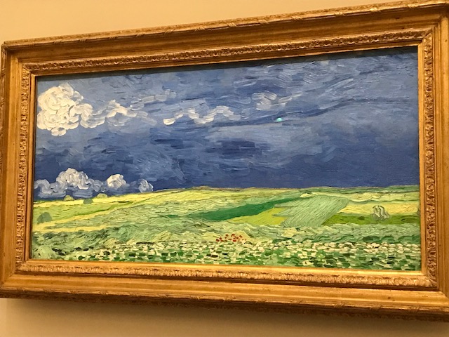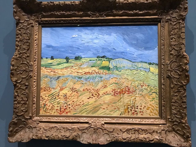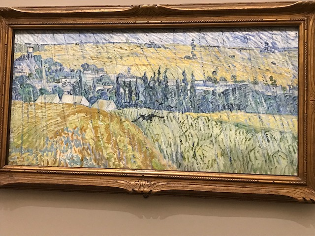 La peinture disais-je comme ultime recours face à un monde qui disparaît. Même s’il ne reste que des images, au moins c’est encore ça. Surtout quand ces images sont peut-être encore les objets les plus concrets qu’il nous soit possible d’appréhender. Quel héroïsme chez van Gogh, notamment au cours des derniers mois de son existence, lorsqu’il peignait au rythme d’un tableau par jour, cherchant à chaque amorce d’une nouvelle toile la solution d’un problème, inaugurant chaque fois une nouvelle manière de peindre, s’inspirant tour à tour de ce qu’il a vu des estampes japonaises ou du souvenir des grands maîtres qu’il a aimés. Il a peint la pluie, il a subverti les habitudes de cadrage en mettant au premier plan une masse de terre ocre ou rousse qui refoule à l’arrière les prés, les bois et les villages, il a usé de formats qui passaient pour incongrus lorsqu’on veut faire un paysage : des carrés et des double-carrés. Il a tantôt cerné d’un trait noir ses formes de rue, de murs et de jardins, tantôt au contraire laissé les surfaces se rencontrer et fusionner.