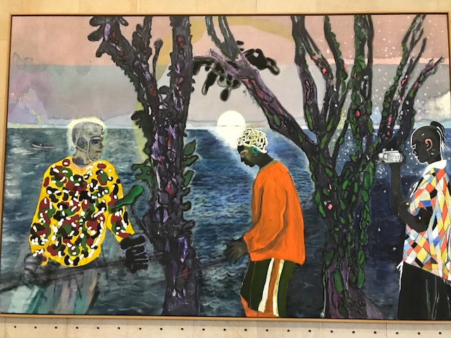 si nous sommes au temps du simulacre, quelle interprétation donner aux tableaux de Peter Doig, actuellement exposés au Musée d’Orsay ? Les toiles de très grand format accrochées sous les coupoles de l’ancienne gare ne sont peut-être pas vraiment représentatives de ce qu’a produit jusqu’ici le grand peintre d’origine écossaise (ayant beaucoup vécu aux Caraïbes), je me souviens en particulier de paysages féériques avec des maisons sur pilotis, de forêts luxuriantes et de pirogues filant à la nuit tombée sur des fleuves en feu. Mais quand même, il y a l’esprit de Doig dans ces toiles. Nous sommes face à des silhouettes si hautes qu’elles sont irréelles, des personnages qui se confondent avec les arbres. Visiblement, là non plus (je fais référence à la pièce Angela (a strange loop)), nous ne sommes pas dans un espace de représentation même si Doig est connu comme grand peintre figuratif. Figuratif de quoi? D’un monde dont il ne resterait que les derniers échos de lumière avant l’obscurcissement final.