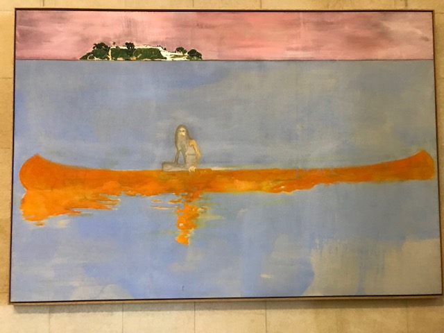 En peinture, ce ne sont pas les pixels qui portent les images, de là vient sa force, ce qui fait sans doute que nous nous y attachions si fort (et c’est pourquoi les espèces de projections numériques dans de soi-disant temples de lumière comme aux Beaux de Provence sont tellement à contre-sens) c’est la touche, la couleur en tube et en pinceaux. Chez Doig, nous avons l’impression d’une surface qui s’interpose entre nous et la réalité, ce n’est pas un écran, car un écran ne fait que réfléchir, c’est un monde de substitution, qui ne représente rien à proprement parler, mais qui pose face à nous les objets d’un rituel semblables aux statues de l’île de Pâques.