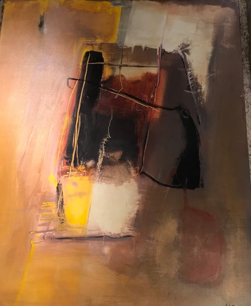 Longue conversation avec le peintre. Peinture toujours aux pigments, sur des toiles de rideau parfois rapiécées, des planches en bois rafistolées, sur plusieurs couches avec parfois des accidents qui font ressortir un point rouge (tel les points chaudes des volcans qui s’alignent au large des îles du Pacifique). Lorsque les couches se répandent sur une toile non traitée, cela donne un aspect mat, la peinture est bue par la substance sous-jacente, et au contraire sur des bases solides comme le bois, elle luit, les blancs d’ivoire resplendissent et les bleus clairs d’azur sourient. Imhoff avoue l’influence de Tapiès que l’on voit en effet dans les ocres, les noirs, les lignes qui partent vers l’inconnu, qu’il barre alors de croix, ce qui me fait me rappeler les images de fils de fer barbelés, les prisons des camps mais c’est là juste le souvenir de l’exposition du matin. Sont là des bleus de toutes les sortes, des ocres, des jaunes lumineux ou des gris terreux. Peu de terre de sienne, me dit-il, car trop opaque, peu de bleu de prusse car ça craquèle. On est au plus près de la fabrique de l’art. On discute des rapports aux hommes qui n’ont pas, semble-til, une grande sensibilité à la peinture, qui n’entrent pas dans la galerie, laissent leurs femmes faire leur choix, ils préfèrent les attendre au bouchon d’en face. Nous convenons qu’il prendra contact avec moi quand il décidera d’organiser des stages dans son nouvel atelier dans la vallée d’Azergues, au nord de Lyon. Imhoff est né en 48, il a vécu en Algérie jusqu’en 62. Il a plein d’enfants et de petits enfants. Le dernier a quatre mois. Grand connaisseur de Lyon, il sait qui est né à la Croix-Rousse (Abbé Pierre), qui y habite encore (Michel Noir), qui y a habité pendant cinq ans (Frédéric Dard).