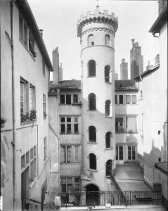 Hier dans ma balade à Lyon, après visite de la très intéressante exposition qui a lieu en ce moment au Musée des Beaux-Arts, qui porte sur la Forme des ruines, d’après un volumineux ouvrage d’Alain Schnapp, archéologue et historien, Une histoire universelle des ruines, établissant la différence entre ruines et vestiges, comparant l’oubli et la mémoire, instaurant une complémentarité entre le rite et la ruine, partant du fond des âges, de la Mésopotamie, pour aller jusqu’à un hier tout proche et même encore actuel (Gaza…), passant par les pillages de l’armée US en Irak et les souvenirs de guerre et de massacres, encore, toujours, gravures de Goya, photos noir et blanc des victimes d’Hiroshima, tableaux de Dali (La Gradiva), de Chirico, de Desgrandchamps, de Sutherland, de Grosz et d’Otto Dix, après un lunch dans un bistrot alsacien, pour une flammekusch, je rends visite à Jean Imhoff qui présente son expo à la Galerie de la Tour, 16 rue du Boeuf. C’est là qu’il y a cette fameuse tour, la Tour Rose, dite aussi maison du Crible.