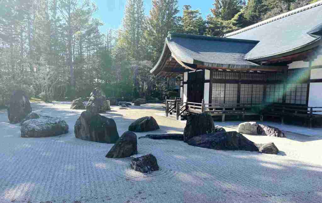 Alors, Mitsue nous emmène dans la dernière étape de la journée, et non la moindre : notre hébergement dans un shukubo. Koya a cette particularité que toute la montagne est sacrée, autrement dit l’enceinte du temple principal l’englobe entièrement, donnant la possibilité de multiplier les temples secondaires, il en est cent dix sept dont une bonne soixantaine sont ouverts au public et peuvent servir d’hébergements. On les nomme shukubo. Et c’est dans l’un d’eux, le plus renommé peut-être, le Rengejo-in, que nous allons dormir une nuit et prendre nos repas (comme il n’a de chambre que pour une nuit, nous devrons déménager le lendemain et nous rendre dans un autre, plus petit, moins prestigieux mais plus cher (!), le Daien-in, au bord de la route, près du centre du village). Le Rengejo-in est un vaste domaine. Il contient bien sûr une sorte de chapelle pour la prière, celle du matin dès 6 heures et celle du soir. Il renferme un très beau jardin sec ombragé d’un érable vénérable. Un prêtre en chef règne sur ce domaine, que j’aurai d’ailleurs à rencontrer, puisque Mitsue en a fait la demande pour moi. C’est lui qui anime la prière du matin. Les couchages consistent en des futons étalés par terre, entre des cloisons fragiles nommées fusuma ornées de panneaux portant des textes calligraphiés. Les repas sont pris en commun dans la grande salle, les convives étant alignés de manière à se faire face deux à deux, accroupis ou agenouillés (selon la souplesse des membres) face à un ensemble de petites coupes et de bols contenant des ingrédients non clairement identifiables ou encore seulement par la négative : ce ne sont ni viande, ni poisson, ni racine de plante, non plus que de légumes ou de fruits ayant trop de goût comme l’ail ou l’oignon. Le bouddhisme ésotérique les interdit pour raison compréhensible de préservation de la vie, de toute vie et même de celle des plantes, mais en ce qui concerne les légumes à trop de goût, je ne sais pas… peut-être serait-ce simplement une… faute de goût. Que reste-t-il ? Beaucoup de tofu dont le village s’est fait une spécialité, des champignons trempant dans un liquide, des choses d’apparence plutôt molle avec évidemment peu de goût. Et bien sûr du riz. Et du thé. L’estomac sera peu rempli, mais qu’importe n’est-ce pas aussi afin de nous défaire de nos pesanteurs inutiles que nous sommes là ?
