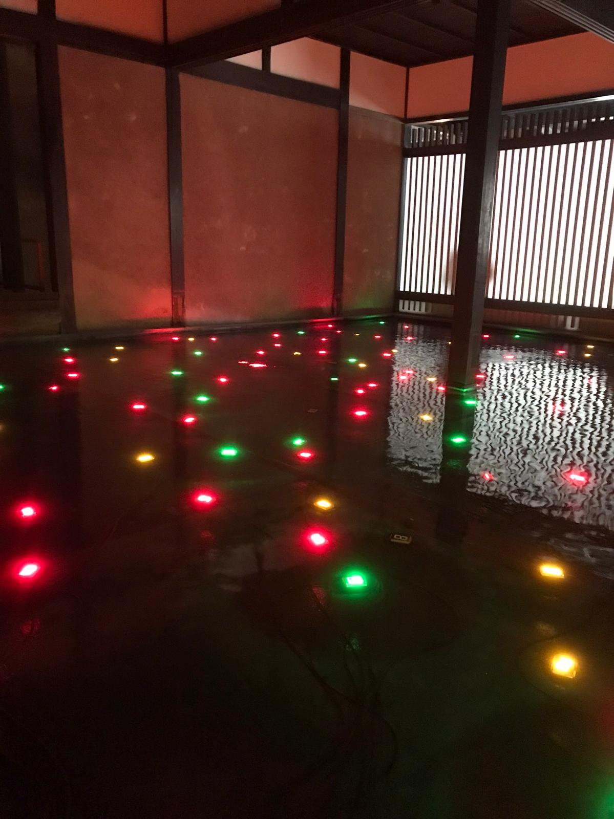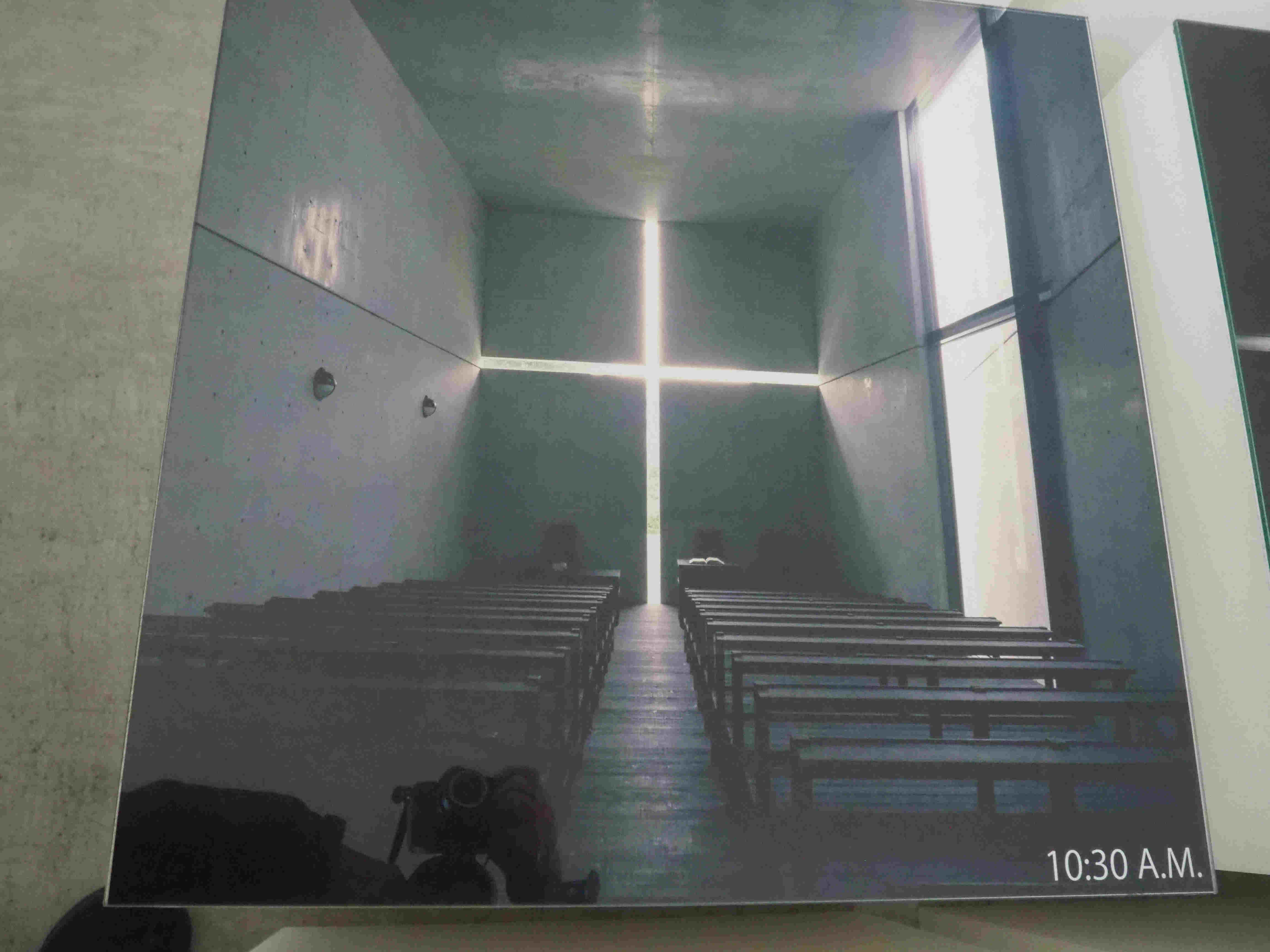 Nos vélos loués nous auront quand même permis d’atteindre par deux fois le port opposé à celui par lequel nous sommes arrivés, Honmura, avec son Art House Project, là où des maisons traditionnelles ont été transformées chacune pour héberger une œuvre unique. Six musées à visiter, six œuvres à contempler. Kadoya contient un parterre inondé où surnagent des lumières LED multicolores (il y en a 125) qui sont chacune un compteur égrenant les dix premiers nombres, le tout à des rythmes différents, définis par des résidents du village (Tatsuo Miyajima, 1998). Minamidera fait, elle aussi, dans l’obscurité, mais la plus totale. Elle se visite par groupes de spectateurs qui ont rendez-vous à une heure bien précise. Nous entrons guidés, et avançons avec une main posée sur la cloison, dans le noir profond, jusqu’à un point où nous nous immobilisons et finissons après que nos yeux se sont accoutumés à l’obscurité, à percevoir des formes blanchâtres ou colorées (James Turrell & Tadao Ando, 1999). Gokaisho met en comparaison les magnolias naturels d’un jardin zen avec ceux sculptés dans le bois de l’artiste Yoshihiro Suda (2006). Quant à Go’o Shrine, c’est un temple de bois avec un escalier de glace qui se poursuit dans les profondeurs d’une grotte que nous atteignons à la lumière d’une torche (Hiroshi Sugimoto, 2002). Le village héberge également un petit musée Tadao Ando, réceptacle de nombreuses maquettes de ses œuvres, dont l’église de lumière, projet réalisé à Osaka à partir d’une commande où l’on demandait la structure la plus simple possible et la moins onéreuse. Ando eut l’idée d’une sorte de boite à chaussures, coupée obliquement par un mur, avec dans un des plus petits côtés, deux failles rectilignes par où passe la lumière et qui se coupent orthogonalement : c’est la croix divine.