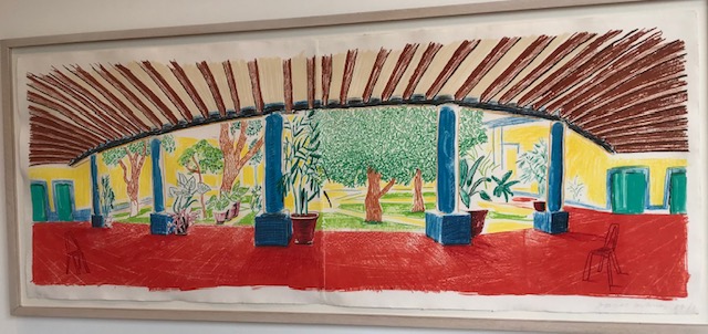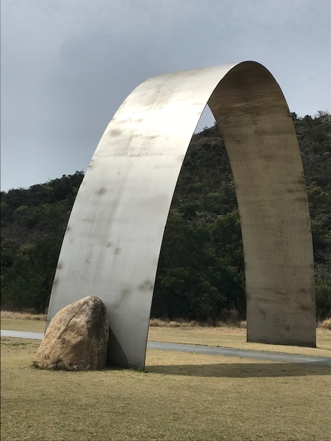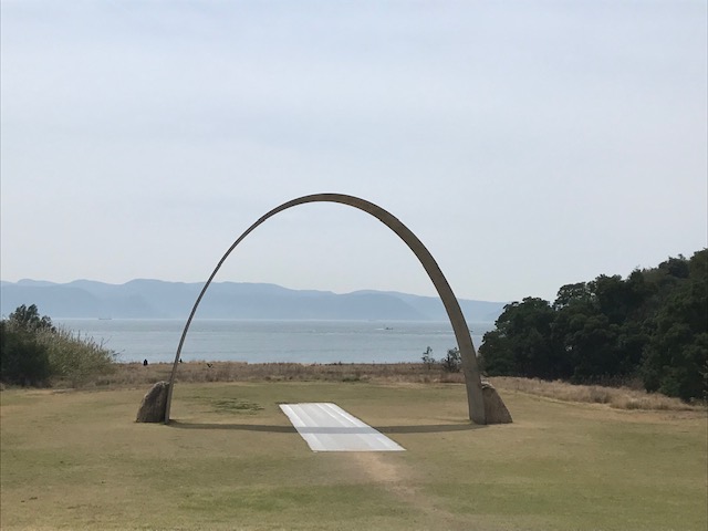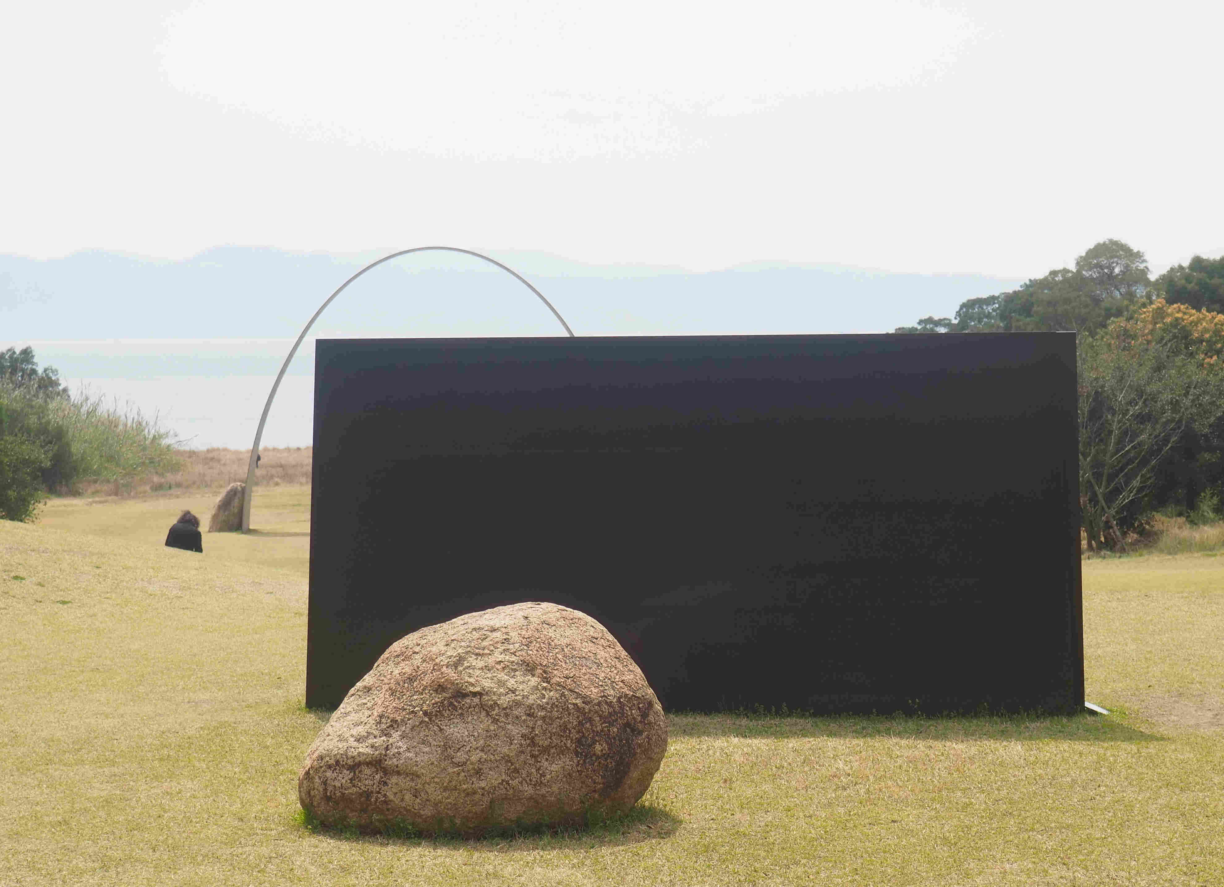 La Valley Gallery expose dans un cadre cristallin une œuvre sur un étang, le jardin de Narcisse, travail monumental de Yayoi Kusama, qui fut exposé à la Biennale de Venise en 1966 et se présente comme un nombre énorme de boules argentées posées sur l’eau, qui renvoient la lumière environnante tout en émettant un murmure constant, celui que font les boules en s’entrechoquant au gré du vent. Juste au-dessus, en bordure d’étang, Les 88 statues de Bouddha créées à partir des scories de production industrielle à Teshima, œuvre créée en 2006 par Tsuyoshi Ozawa, dont le titre en lui-même indique bien ce qu’il faut y voir, la menace toujours existentielle qui pèse aussi bien sur notre environnement, notre monde physique, que sur le monde spirituel. Au-dessus, un petit temple de béton comme les aime Tadao Ando, sans angle droit pour mieux épouser la forme du vallon, filtrant les rayons du soleil et hébergeant sur ses marches quelques-unes des boules-miroirs qui se sont égarées. Vallée plus large et descendant vers une plage, le musée gallerie Lee Ufan mélange aux formes végétales une arche métallique, des rectangles d’un noir profond et un mât qui donne au tout l’aspect d’un navire échoué et disloqué. Plus loin dans la montagne, le musée Benesse qui renferme les David Hockney de l’hotel Acatlan, A Walk around the Hotel Courtyard. Et plus haut, le Chichu Art Museum, le musée enterré. Mais hélas, nos déplacements en bicyclette (électrique) ont pris trop de temps et nous arrivons trop tard : le nombre limite de visiteurs a été déjà atteint et nous ratons ce qui, paraît-il, est le plus beau de l’île…