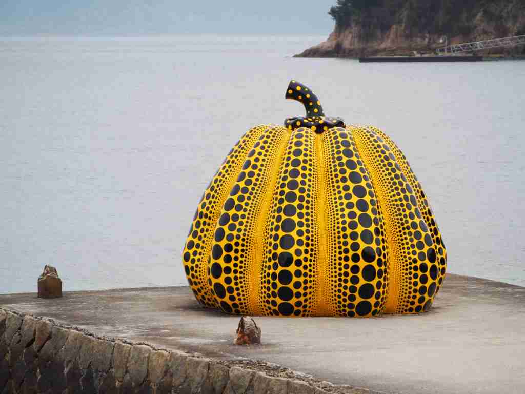 L’île de Naoshima est un petit paradis artistique. On y accède en prenant le shinkansen jusqu’à Okayama, puis, de là, un petit train régional qui conduit au port d’Uno, à condition de changer à Chamayachi (je le dis car on ne sait jamais, vous voudriez peut-être y aller et en général ce détail ne figure pas sur les guides), agréable parcours ferroviaire ponctué d’étapes fleuries avec des publicités pour un train touristique qui s’intitule (en français dans le texte) La Malle de bois (circule entre Okayama et Onomichi tous les dimanche, on peut y mettre son vélo). De gros ferrys font la navette entre Uno et Miyanoura, le port principal de Naoshima, le trajet met vingt minutes, c’est dire comme l’île est proche de la côte de l’île principale, ici, c’est encore Honshu, mais si on poursuit la traversée, de l’autre côté, on sera à Shikoku, dont on aperçoit au loin les villes côtières, telle Takamatsu. L’arrivée se fait dans un petit port qu’on ne se lasse pas de regarder, avec ses boutiques basses, ses filets de pêcheur, sa nonchalance exposée montrant un Japon d’un autre âge, qui n’aurait pas évolué, pas connu la guerre, ni l’explosion industrielle. Pas étonnant que de grands artistes aient désiré y vivre et y produire. La jetée qui nous accueille est ornée en son extrémité de l’une des fameuses citrouilles de Yayoi Kusama, the Red Pumpkin. Cela annonce la tonalité : nous serons immergés dans l’art contemporain et particulièrement le Land Art, celui qui cherche à s’harmoniser avec les paysages. Le coup d’envoi de la tradition artistique fut donné par le grand architecte Tadao Ando qui a déposé son empreinte un peu partout en ces lieux. Les bâtiments du musée Chichu sont enterrés et les salles sous-terraines. Des œuvres parfois sombres, toujours magiques, s’incarnent au sein de maisons traditionnelles ou d’anciens temples rénovés. L’autre grand artiste du cru est Lee Ufan, qui transforme une vallée en œuvre d’art. Et comme dit précédemment, la grande Kusama est venue par là, elle aussi, y installant ses miroirs de Narcisse et autres citrouilles jaunes ou rouges.