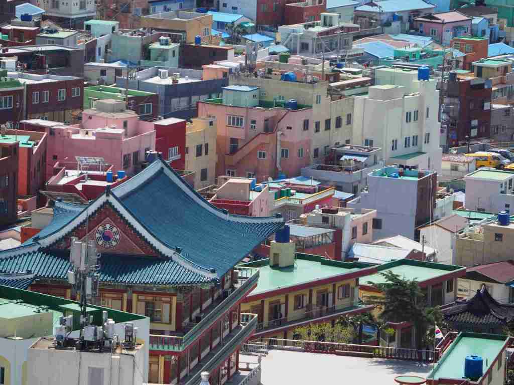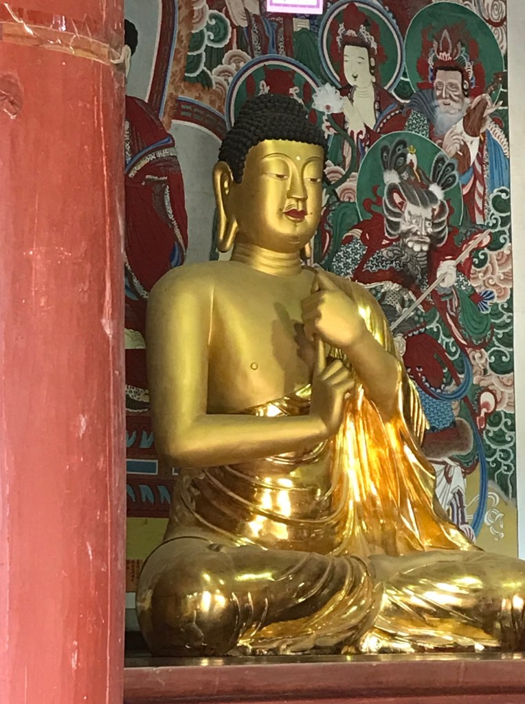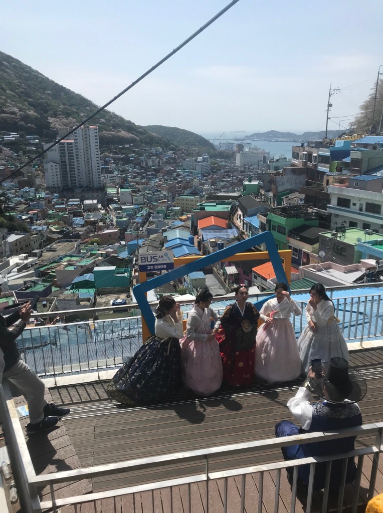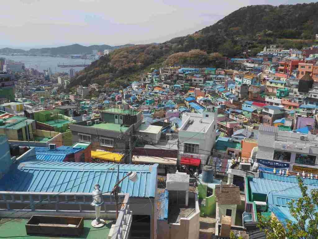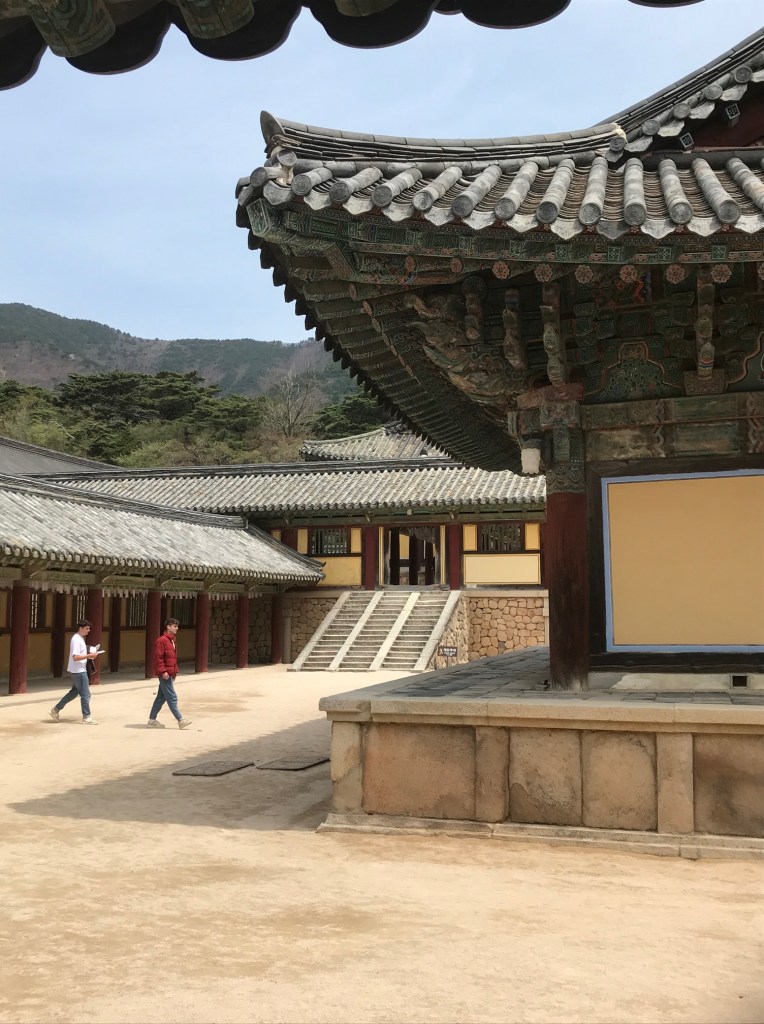 L’arrivée se passe aussi bien que le départ, contrôles légers. Nous ne savons pas très bien où se trouve l’Hotel Soyu. Par chance, il est au pied de la tour de Busan. Il sera donc facile de le retrouver. Tout près du Musée du Cinéma (la ville héberge un festival annuel presque aussi connu que celui de Berlin). Nous visiterons le Musée du Cinéma mais ne comprendrons pas grand-chose aux explications. Quartier d’hôtels, de restaurants. Nous irons à pied le lendemain jusqu’au village dit « artistique et culturel » de Gamcheon. Marche sous le soleil, colline à gravir un peu raide. Petit temple à flanc de colline dominant la baie avec prêtresse vêtue de blanc sûrement pour une cérémonie funèbre. Gamcheon est joli : c’est plaisant toutes ces petites maisons de toutes les couleurs qui s’entassent les unes contre les autres et toutes ces terrasses, mais c’est plus un lieu de commerce et de marchandises qu’un lieu d’art, et ce lieu est plus émouvant par son histoire, celle d’une concentration de cabanes précaires pour des réfugiés vivant dans la pauvreté que par son actualité. Mais qu’importe, il règne une atmosphère de vacances. Les Coréens rencontrés dans les rues piétonnes du centre nous paraissent joyeux. Mes sombres prémonitions se sont effacées. Quand nous irons visiter les sites de Gyeongju (emplacement de la première capitale, celle des rois de Silla aux alentours des années cinq cents), nous retrouverons cette ambiance de fête autour des tumulus royaux et parmi la foule qui visitera le temple de Bulguksa, comme si l’histoire ici était moins lieu de recueillement que d’insouciance, voire d’indifférence. Ce jour-là, 10 avril, était jour des élections générales, les gens avaient congé pour l’occasion, raison pour laquelle il y avait tant de monde partout. L’enjeu était de taille : l’actuel premier ministre voulait se lancer dans une politique du style « illibéral ». Les électeurs ont rejeté cette politique avec une forte majorité (et un taux de participation élevé), ce qui a entraîné la démission immédiate du premier ministre. Le peuple coréen s’est battu avec courage contre les dictatures, il en garde le souvenir, malgré cette impression d’insouciance qu’il peut donner. Prenons-en de la graine. Gageons que l’on aura peu parlé en France de cette nouvelle victoire contre l’autoritarisme, attaché que l’on est à souligner au contraire la progression des droites partout dans le monde.