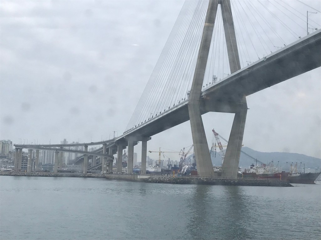Lorsqu’on entre « port de Busan » dans le moteur de recherche, des images de pont apparaissent. Apparemment ils sont nombreux dans la baie. Le plus grand est photographié sous des angles divers. Les bateaux passent en-dessous. Un grand pont. C’est ce que l’on voit en premier de la Corée lorsqu’on arrive du Japon par la mer. On le voit de loin, éclairé la nuit comme un arc bandé, la flèche pointée vers la lune.