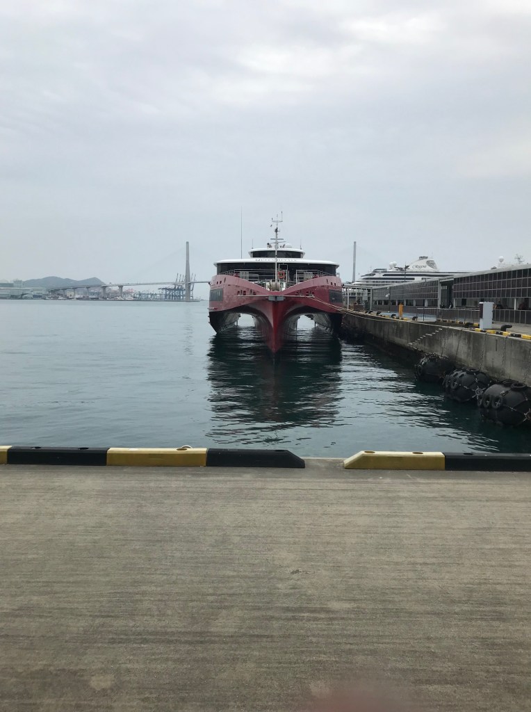 Il avait fallu changer notre date de départ, était-ce prémonitoire ? La compagnie avait annoncé par mail un avis de tempête pour le jour prévu de notre traversée, nous suggérant d’en changer la date, de l’avancer peut-être. Pourtant l’appli météo de mon smartphone annonçait un grand soleil. A qui se fier ? Au port, le guichet était encore ouvert jusqu’à 15 heures, nous étions un dimanche, heureusement il était moins dix. J’ai donc sonné pour qu’une élégante préposée à l’uniforme stricte vînt à notre rencontre. Evidemment elle ne savait rien du temps qu’il allait faire dans deux jours mais puisque la compagnie le disait, il valait mieux en effet que nous changions nos dates. Elle prit donc nos noms et nous remit un ticket pour le lendemain matin, avec cette jolie courbette dont les gens d’ici sont familiers, et le lendemain nous nous levâmes tôt afin d’être dès sept heures à l’embarquement (dommage, l’hôtel était bien). Tout se passa comme prévu. Franchissement de douane étonnamment léger, pas de fouille, ça n’existe pas les explosifs là-bas. Bateau impeccable qui, tel un TGV ou un Shinkansen, prend de la vitesse aussitôt parti et se met à planer au-dessus des vagues, en trois heures nous étions à Busan. Mer grise. A l’approche du port, nous sommes impressionnés par le gigantisme des installations portuaires, les tours de quarante étages qui dominent la mer, nous vivons exactement ce que Elisa Shua Dusapin décrit dans son roman Les billes du Pachinko :