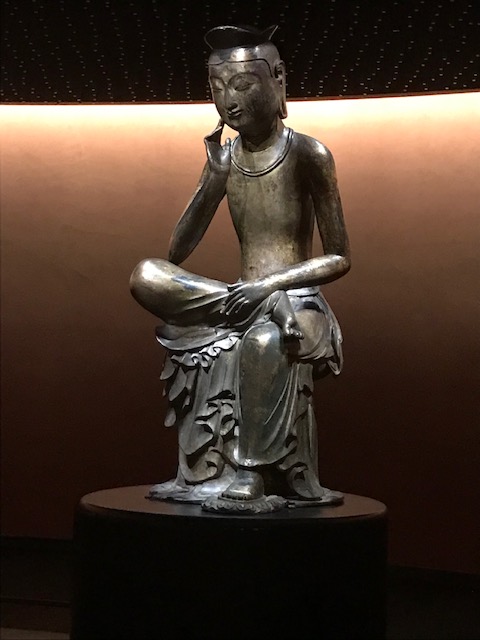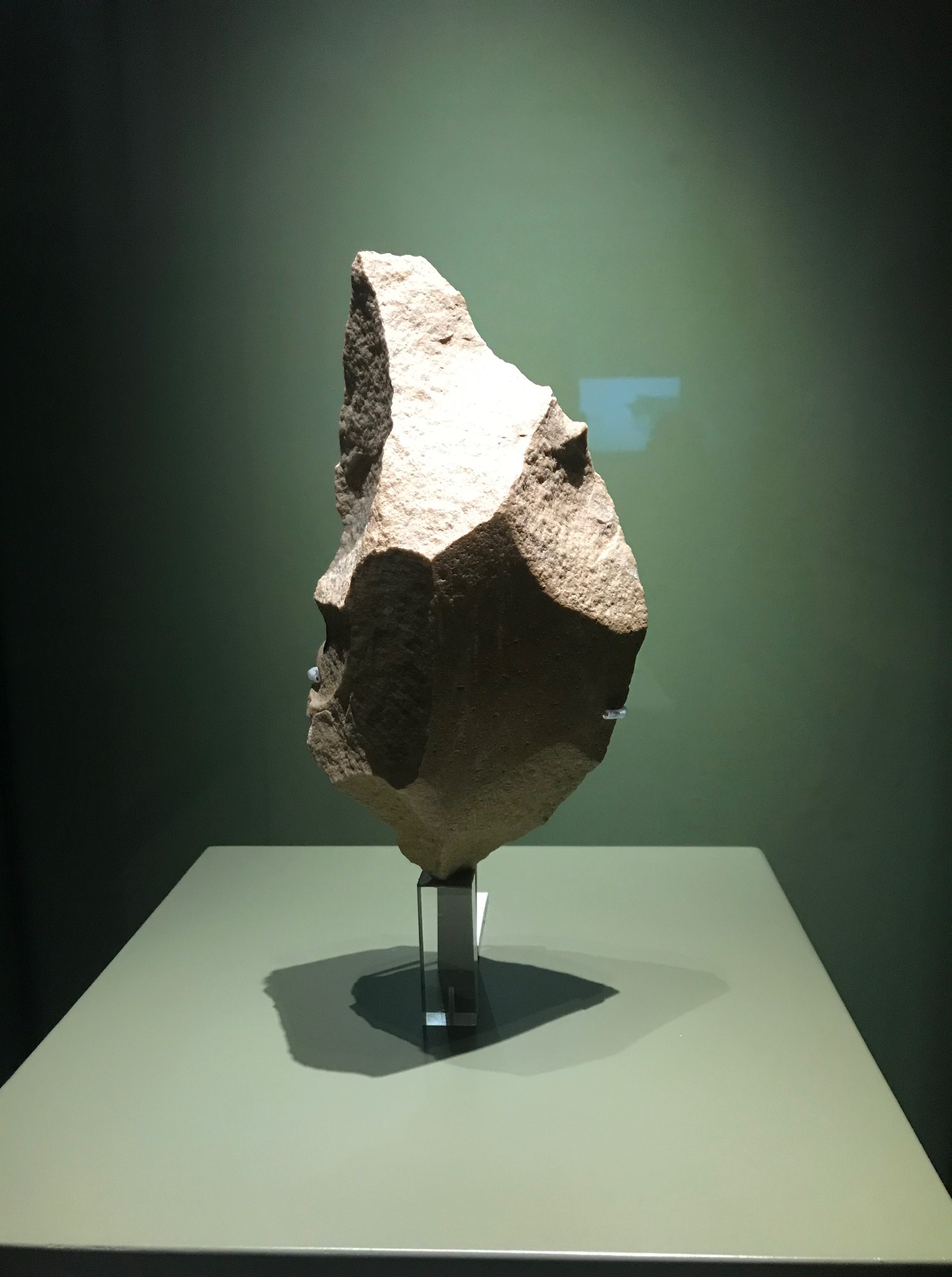 Seoul possède l’un des plus beaux musées du monde, si ce n’est le plus beau. Le Musée National de Corée. Beau d’abord par son architecture, long rectangle avec des ouvertures vers le ciel, hall central large comme une avenue et de part et d’autre, sur trois étages, des salles où sont exposées trouvailles archéologiques et œuvres splendides, suivant, au premier étage, le cours de l’histoire, depuis le paléolithique jusqu’aux années 1910, époque où la Corée que ses habitants appelaient alors Chôson du nom de la dynastie régnante, perdit son indépendance et tomba sous l’occupation japonaise. C’est l’occasion de retrouver le bout d’histoire que nous avons observé au Japon, à Asuka, lieu où s’était implantée la première capitale, Fujiwara-kyô, en plein VIIème siècle, dont le plan et toute la tradition culturelle venaient justement de Silla, l’un des anciens royaumes composant la péninsule, avec Koguryo et Paekche. C’est comme si deux bouts de notre voyage se recollaient. Avec en amont le paléolithique symbolisé par une pièce rare, un biface de l’âge de pierre récolté là où l’on pensait que l’on n’en trouverait pas, car on croyait en une dichotomie de l’espace préhistorique qui aurait séparé (c’est le carton d’exposition qui le dit) les cultures de l’âge de pierre d’Europe et d’Afrique de celles de l’Asie du Sud et de l’Est, les premières étant celles du biface (handaxe) et les secondes du galet aménagé (chopping tool). Ce genre de détail me fait toujours jubiler, il ne sert pas à grand chose de les connaître, mais ils ont ceci de particulier de nous plonger en une fraction de seconde dans un univers de recherche. Le temps, le plus de cent mille ans, et jusqu’à trois millions d’années, s’annule et nous devient proche, nous pourrions pour un peu tenir entre nos mains ces témoignages de nos origines communes. Ces trouvailles qui renversent les fausses certitudes m’enchantent aussi, montrant que toute classification, toute séparation est destinée un jour à être subvertie.