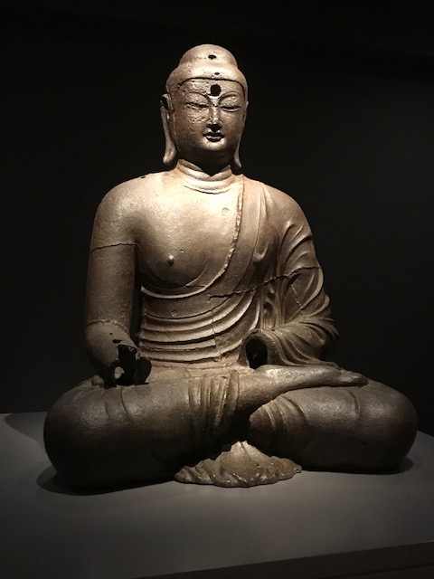 Avec les premiers temps historiques, viennent les premières grottes. Les parois de l’une sont reproduites, peintures d’une grande finesse et d’une grande expressivité, reliées à des légendes et des croyances religieuses, ici les Dragons protecteurs des tombeaux, gardiens des quatre points cardinaux, assurant à l’espace l’harmonie du yin et du yang, à l’heure où s’implante l’antique royaume de Koguryo. Le royaume de Paekche (ou Baekje, selon les translittérations) n’est pas en reste, il est le siège d’un important développement artistique et artisanal à partir du premier siècle. Silla vient un peu après, et a ceci de notable qu’outre le fait d’avoir été baptisé le « pays de l’or » en raison de ses ressources et de sa spécialisation dans le travail du métal précieux, on voit s’y répandre l’écriture, donnant naissance à une vraie « littérature », consistant au début dans des inscriptions sur des stèles, avant de déboucher sur des feuillets manuscrits quelque peu analogues à ceux que nous avons vus à Asuka, au musée de la Man.yôshû. Les conflits entre les royaumes sont nombreux au cours de cette période, certains disparaissent, d’autres prennent leur place, comme Palhae (entre 700 et 926), baptisé « le Pays de l’Est Florissant» qui se place sous l’autorité conjointe du confucianisme et du bouddhisme, avant d’ouvrir la voie à une première unification des royaumes (Silla unifié), au cours de laquelle l’art combine les styles de Paekche, de Koguryo et des Tang chinois pour donner lieu à de colossales images de Bouddha parfois ensevelis sous des dômes au sommet de montagnes (près de Gyeongju, grotte de Seokguram).