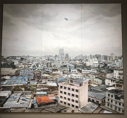 L’art contemporain coréen s’expose au MMCA, on y trouve notamment The More The Better, de Paik Nam June (1988), première œuvre video jamais réalisée : Paik Nam June, dit-on sur l’affiche, a créé l’art communiquant avec le monde à travers la télévision à une époque où Internet n’existait pas encore. The More The Better est une installation video à grande échelle basée sur 1003 moniteurs conçue comme faisant partie de la célébration des JO 1988, le système, arrêté entre 2018 et 2022 a été restauré. En faisant cette opération, les conservateurs ont réalisé que « toutes les œuvres ne pouvaient durer éternellement, la technologie et l’environnement changeant sans cesse ». On conclut sur l’affiche que cette œuvre est « l’épitome d’une collection variable ». Amusant, ce moment d’une prise de conscience d’une caractéristique fondamentale de l’art qui est d’être, quoiqu’on en pense, voué à disparaître (combien de chef d’œuvres de la Renaissance ont péri dans les flammes). Gim Hongsok réfléchit sur les conditions de production et de réception de l’art au moyen d’une installation qui comprend divers environnements pour les mêmes objets. Mais Lee Hyein me touche davantage. Elle est résolue à partir sac au dos, équipée d’une tente bivouac et de son matériel de peintre pour saisir sur le vif des fragments de nature en faisant ressentir sur la toile tous les inconforts, toutes les imperfections dues à sa situation. Cela donne des séries de petites toiles dont l’ensemble s’intitule La Seconde Vie, j’aime cette peinture modeste, de fruits tombés sur le sol parmi des feuilles séchées, de bêches et de brouettes abandonnées contre les murs de cabanes de jardiniers, de poteaux électriques qui surgissent au milieu d’un champ de betteraves. On peut aussi parler de Jung Jaeho qui se concentre sur la période où la Corée se reconstruisait et vivait une sorte de période des trente glorieuses un peu décalée, toile gigantesque qui pourrait sembler triomphante si une menace ne planait dans l’air, celle d’une rocket immobilisée dans le ciel. Et puis de Jung Youngsun, pionnière de l’art paysagiste, à qui l’on consacre une retrospective. En photographie, je rêve de voir un jour une exposition consacrée à Han Youngsoo dont les photos noir et blanc dignes de Doisneau et de Cartier-Bresson nous plongent dans la Corée des années soixante.