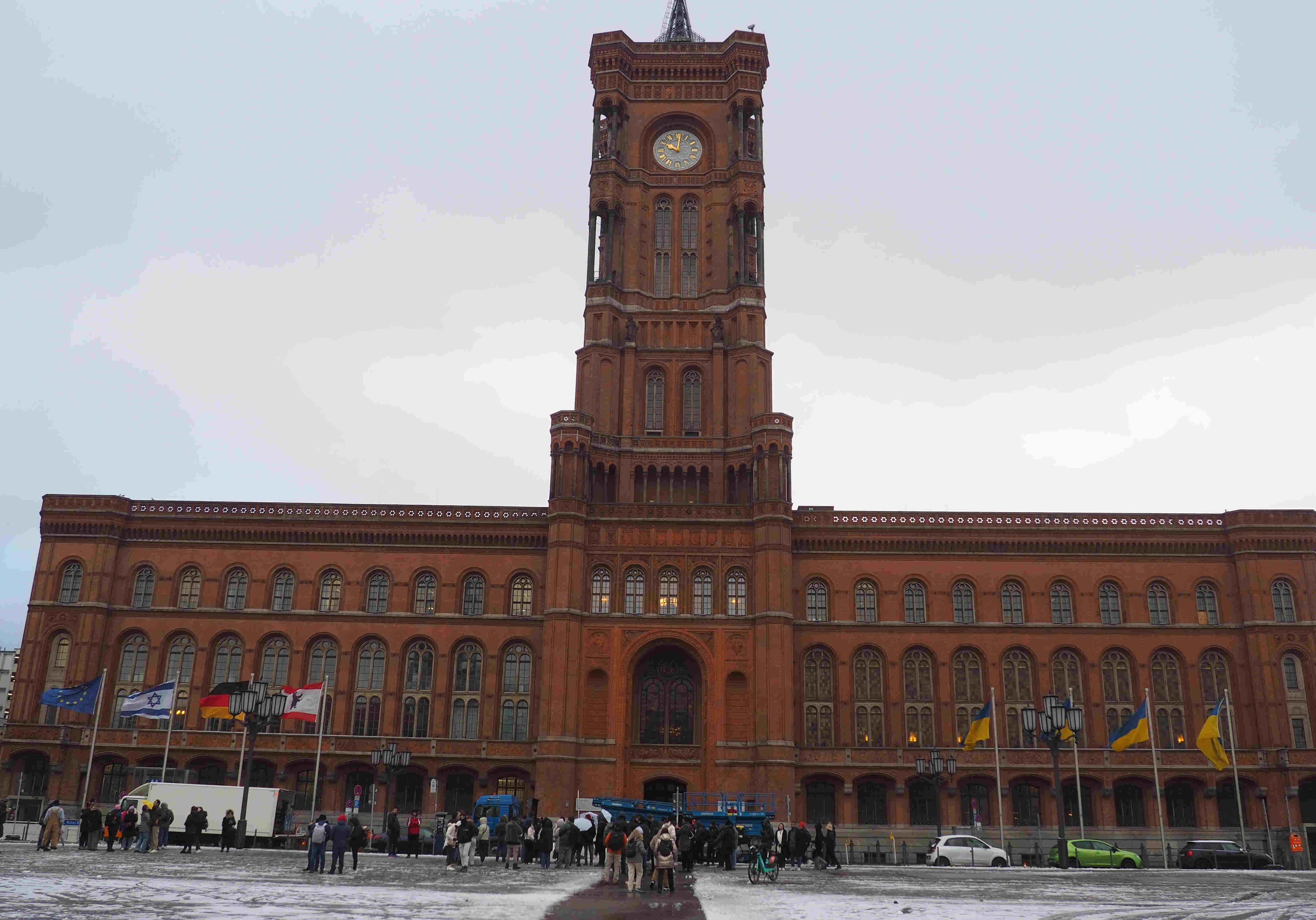 Au matin, alors qu’il a neigé toute la nuit et que la neige tombée se salit aux endroits où elle a été piétinée ou compactée par les roues des voitures, ou bien se transforme en petits tas gelés à cause de la température négative, que le bout du pied heurte en marchant dans un craquement qui résonne dans l’air glacé mais non pur car il est pollué de tous les gaz qui s’échappent d’une ville, nous nous étonnons de la hauteur des immeubles, de la largeur de l’avenue et de la distance qu’il faut franchir pour aller de notre hôtel à la maison de bois encore munie des décorations de Noël que l’on aperçoit en diagonale du carrefour. Dans ce chalet gît l’espoir qui sera déçu d’une tasse de café. Autant prendre immédiatement le U-bahn, ligne 5, que l’on attrape à la station Weberwiese, station monumentale refaite dans les années 2000, et recouverte à cette époque de carreaux du même jaune que celui des piliers qui la soutiennent. Le métro vient de Hönow et va vers la grande Gare Centrale. Nous descendons à Rotes Rathaus, autrement dit au vieil hôtel de ville tout de briques rouges, fleuron de l’architecture néogothique et néorenaissance. Il fait face à un parc et à une église, il n’est pas loin de l’Alexander Platz, et on y attrape un bus, jaune lui aussi, qui pourrait bien être le 200, qui se dirige vers Zoologischer Garten et nous dépose devant la Philharmonie. C’est-à-dire, aussi, près de la Pinacothèque et de la Galerie Nationale. Que de splendeurs en ces galeries… Nul ne saurait les énumérer toutes. Mais si déjà on en cite quelques-unes, ce sera bien. Alors allons-y.