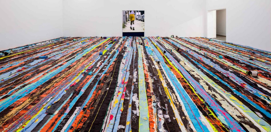 Bradford utilise tous les matériaux : collages de bandes de papiers, videos, plâtre, tissus. Il exprime par leur moyen, aussi bien le sentiment de solitude métaphysique que le meurtre de George Floyd par une video où il s’écrit, en s’allongeant toujours plus, le message I cant breeeeeeeeeeeeeath.