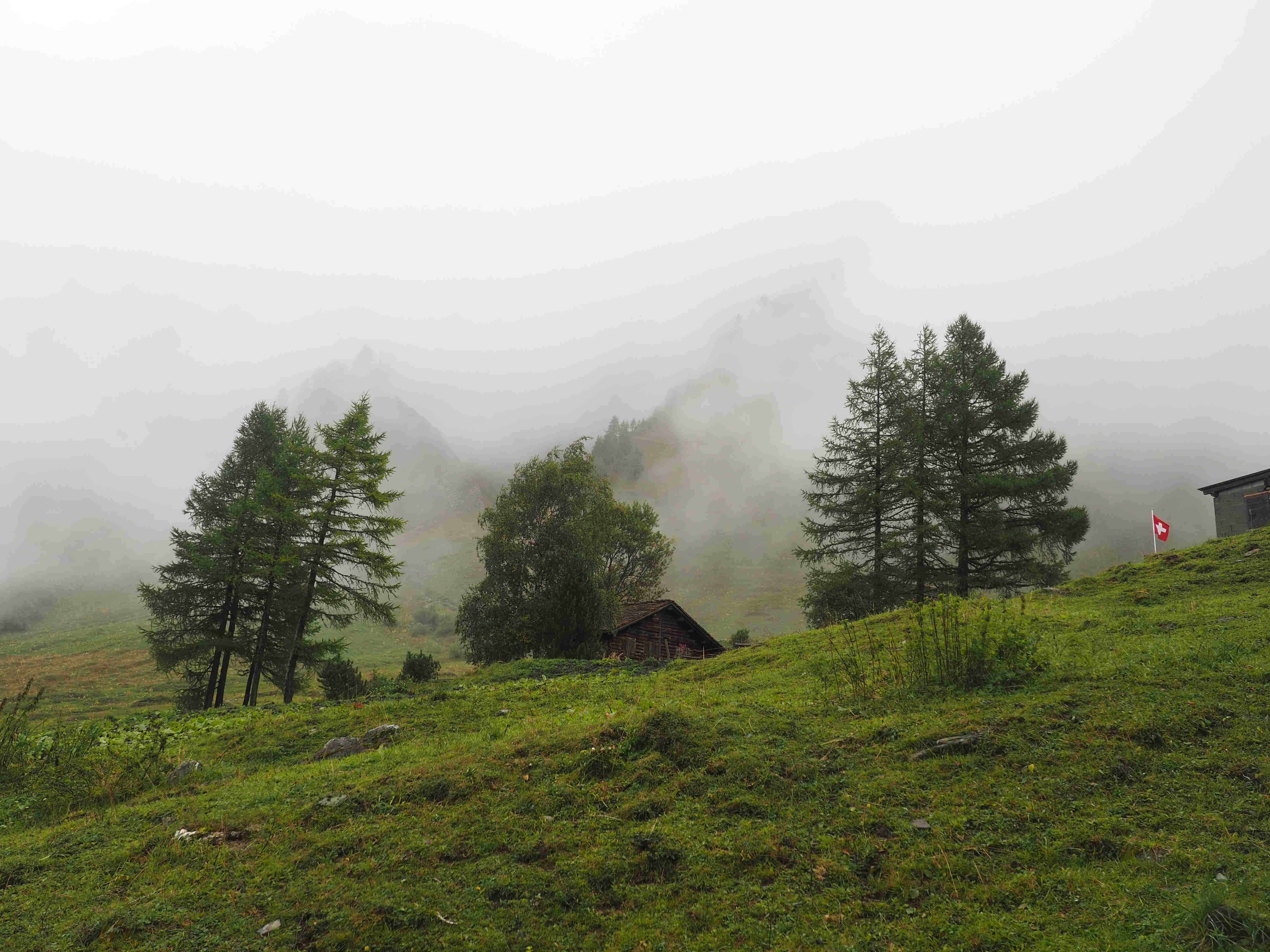 A 1800 mètres d’altitude, au-dessus du premier village suisse qu’abordent les marcheurs qui font le tour du Mont-Blanc dans le sens inverse des aiguilles d’une montre (curieusement je n’en ai jamais rencontré qui le fassent dans l’autre), émerge de la brume, quand il y en a, et il y en a souvent, un alpage, celui du Mont Percé, où viennent estiver les bêtes de la vallée. Par bêtes entendez des vaches bien sûr. Car les humains sont peu nombreux à passer tout l’été à cette altitude. Et pourtant il en faut bien pour les garder et surtout les traire. C’est un travail terrible. Je ne peux regarder, quand je les croise sur mon chemin, ces hommes harassés, souvent à la recherche des bovins dont ils ont la charge, sans ressentir en moi un instant de panique. Ils me semblent si loin… comment pourrais-je être capable, moi, d’un tel labeur continuel, qui commence à la mi-juin pour s’arrêter à la mi-septembre, sans aucune trève, aucune vacance, les animaux n’en ayant pas, n’en prenant jamais, continuant à brouter le matin, le soir et même la nuit, et exigeant qu’on les vide de leur précieux lait deux fois par jour, et toujours aux mêmes heures, en l’occurrence, le chiffre 3 est à l’honneur, on les traite à 3h de l’après-midi et on les traite à 3h du matin.