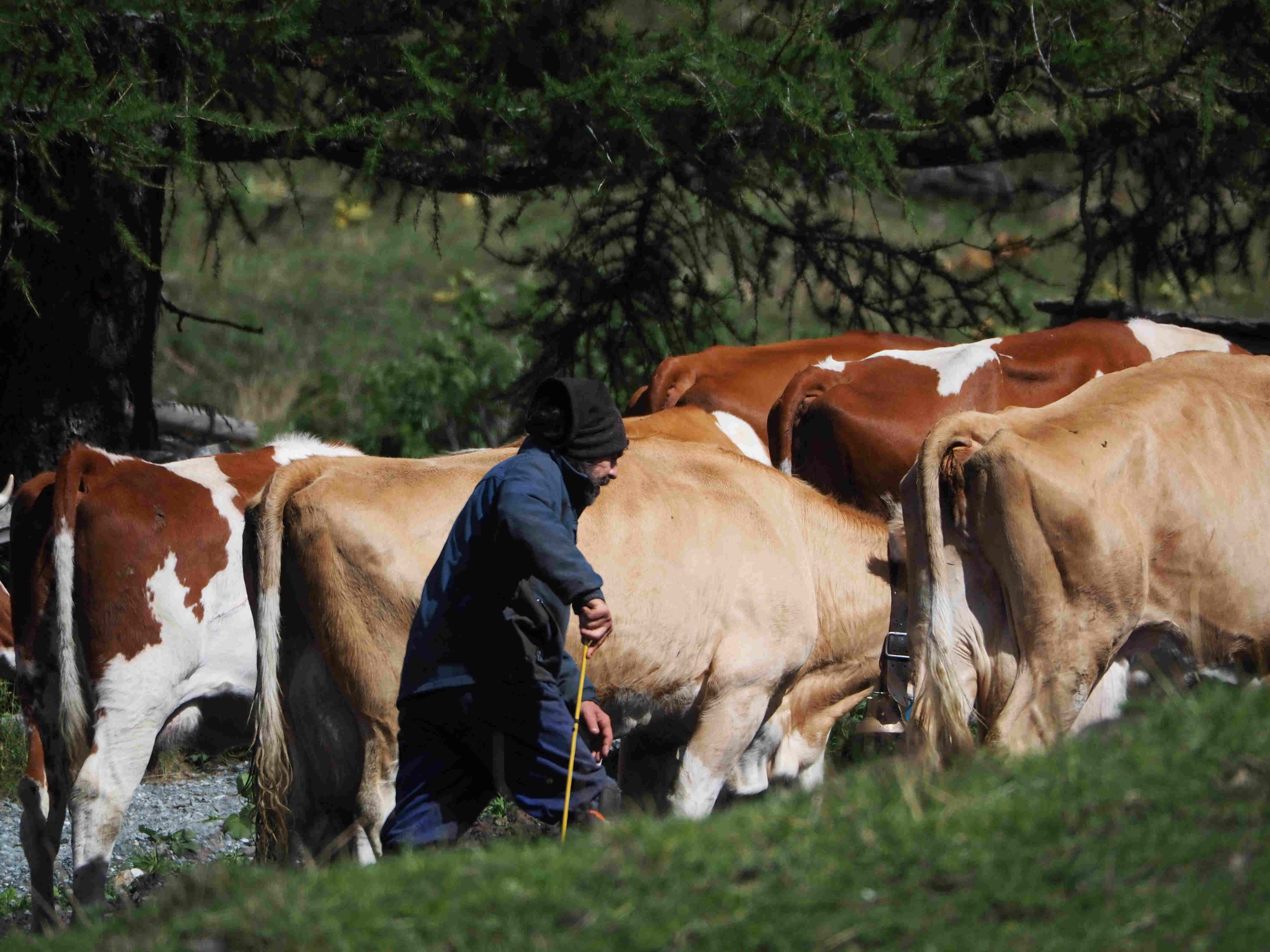Le berger le plus petit, celui qui a des cheveux longs qui lui tombent sur le visage, et une barbe hirsute, me dit que c’est dur, et qu’ils en ont encore pour trois semaines. Il ne parle pas très bien le français mais je comprends qu’il me dit dans un sourire, presque un clin d’oeil, que pourtant il les aime ces vaches. Je le crois volontiers. Ces animaux sont d’une tranquillité qui nous apaise, on ne saurait deviner en elles la moindre agessivité. Elles demandent juste qu’il y ait de l’herbe grasse et qu’on les traie.