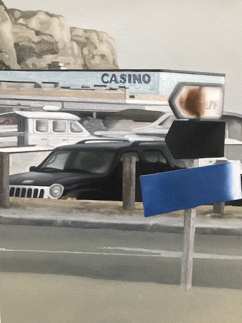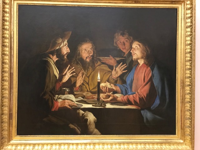 A Grenoble, Bresson a répondu à l’invitation lancée par le directeur du musée, Sébastien Gokalp, de se positionner dans un projet plus vaste, s’adressant à d’autres plasticiens, intitulé « En regard », consistant à s’inspirer de tableaux de la collection permanente. On voit évidemment tout de suite le parti qu’il peut tirer de Bernardo Strozzi, du Dominiquin ou de Mathäus Stomer, tous peintres de la Renaissance ayant peint le Christ à Emmaüs ou bien Dieu réprimandant Adam et Eve. Mais c’est plus surprenant de le voir se coltiner avec une salle que peu de visiteurs connaissent : celle de l’art minimal américain des années cinquante à quatre-vingt, représenté en ce musée par Robert Mangold (Distorted square within a square, 1974), Max Bill (Champ avec un accent en vert, 1948), Josef Albers (Green-Grey Shield. Homage to the Square, 1959) et Carl André (Flanders Field, Cèdre rouge du Liban, 1978). Lors de ma première visite, je n’ai pas su bien répondre à l’appel. Il a fallu que j’entende le peintre commenter son travail pour que je me décide à y retourner, et que je « voie », enfin, conformément à la maxime que je rappelais plus haut. Que je voie la trame. La grille qui sert à la perspective méticuleuse, les personnages qui s’y inscrivent à l’issue de calculs savants (Bresson raconte qu’à l’époque de sa scolarité aux Beaux-Arts, personne n’enseignait ces techniques de perspective, et qu’il lui a fallu aller lire des lettres de Poussin, pour y trouver les leçons qu’il cherchait). D’un tableau à l’autre, des personnages identiques. Preuve que ce n’est pas « le réalisme » qui est recherché. Jamais de titre : Bresson dit que c’est là ce qui le distingue de la peinture d’histoire qui l’a passionné lors de son arrivée à Paris, dans cette dernière, le sujet préexiste, marqué par un titre que l’on a déjà donné au tableau, alors que chez lui, ce n’est pas le cas, c’est la matière et la mise en scène qui priment, le sujet ne vient que des interprétations données par les spectateurs. Le contenu compte bien sûr : évidemment il y a là de la violence, et des représentations de personnages qui, à l’époque en tout cas de la réalisation de ces tableaux, étaient peu présents dans la pratique artistique, il a bien fallu que Bresson réfléchisse à cela, et il s’est aidé de lectures. Bourdieu est devenu le sociologue familier. Et l’écrivain Edouard Louis est venu à sa rencontre. Bresson a compris que le rôle du peintre était, non pas de « délivrer des messages » mais de montrer le temps présent. Ainsi se lance-t-il désormais dans la monstration des vieilles personnes au sein des EHPADs. On a hâte de voir. Un chantier s’ouvre à lui : la décoration d’une station de métro nouvelle du Grand Paris, pour laquelle il devra se replonger dans l’art de la fresque.