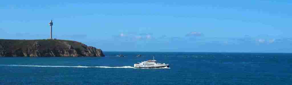 Nos vélos ont ensuite vite fait de nous transporter du côté sud, vers la lande qui domine la sortie du port. Le Fromveur, bateau de la compagnie Pen Ar Bed, s’apprête justement à passer le courant du même nom, qui sépare Molène d’Ouessant et dont les périls sont signalés par le phare de Kéréon. Ce courant est une rivière rapide, dont la direction change avec le sens de la marée, il peut entraîner les voiliers vers de grandes vitesses, ou au contraire, s’avérer être un dur obstacle à passer… mais nous ne voyons presque jamais de voiliers. Au retour vers Lampaul nous repérons l’emplacement de la chapelle où aura lieu le concert du lendemain.