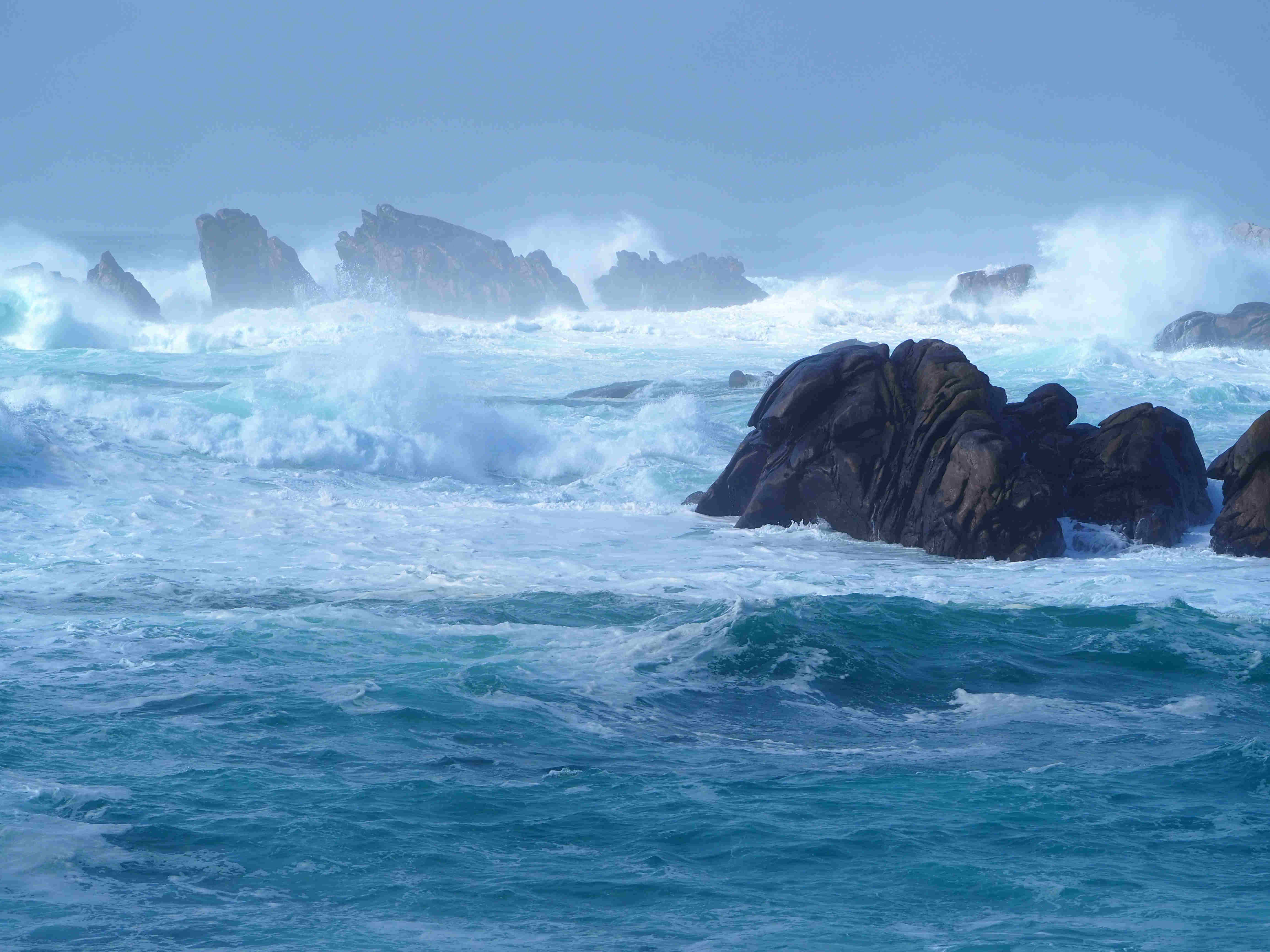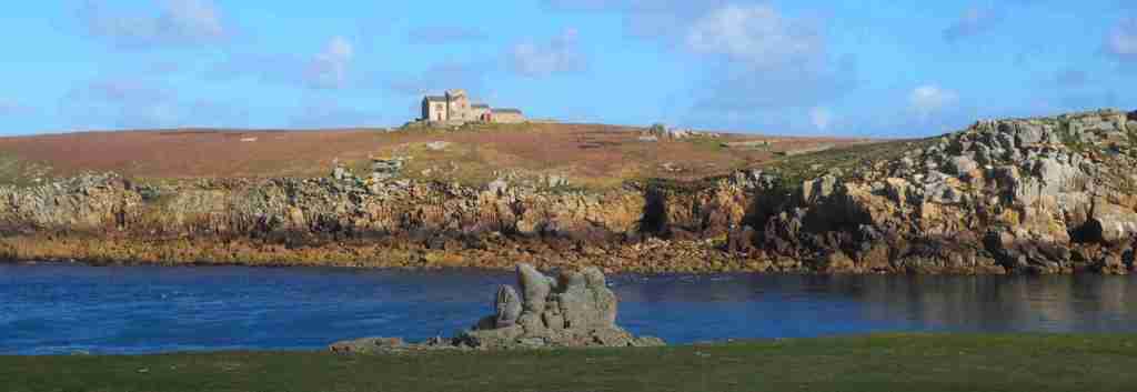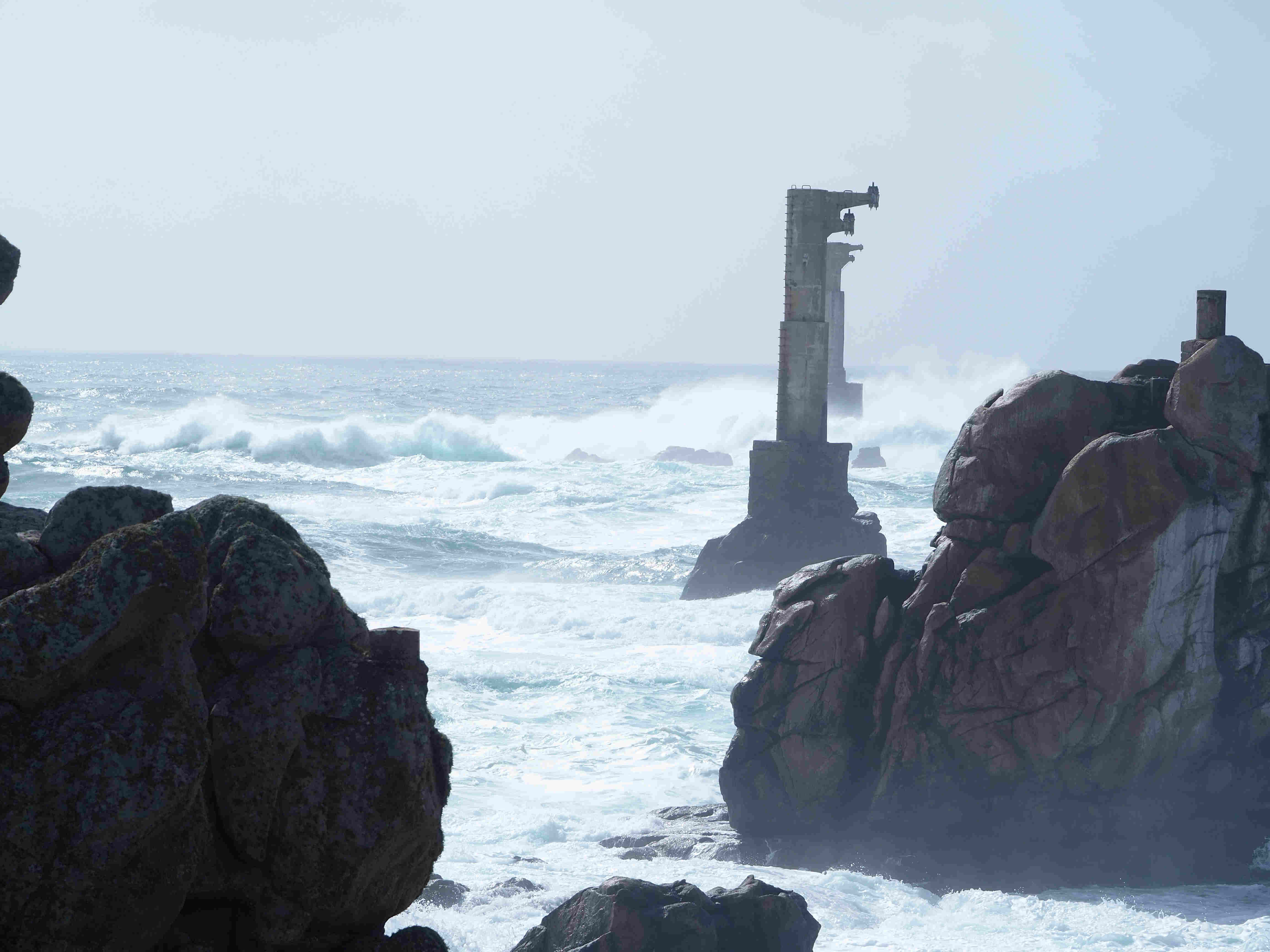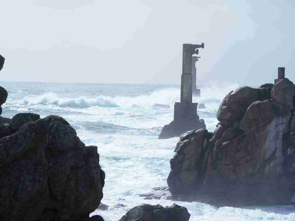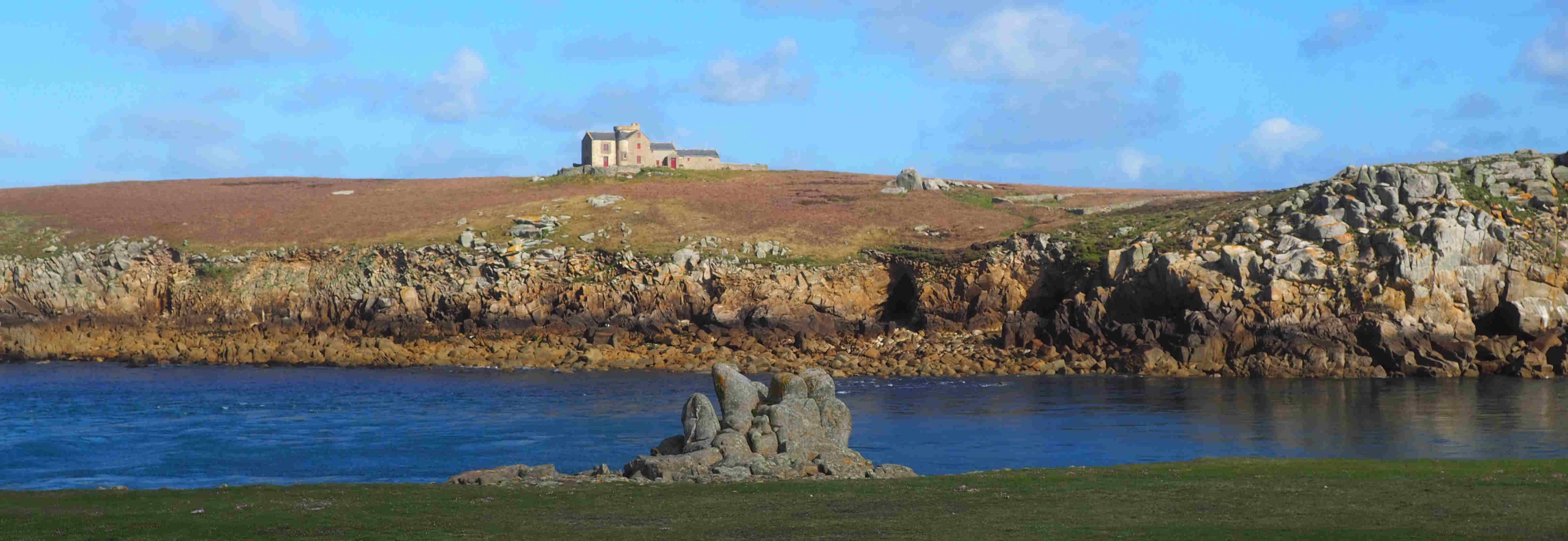 Et puis, une fois posées bagages chez la Marie-Noëlle, celle qui gère le gite en haut de la pharmacie du bourg, on part vers l’ouest, toujours plus à l’ouest, comme attirés par le mouvement du soleil, happés par le bruit des vagues à la marée montante, marchant au bord des gouffres, dans l’herbe épaisse que broutent de vieilles chèvres et de vieux boucs laissés à l’abandon depuis qu’on a décidé de ne plus s’occuper d’eux, contournant l’ancre de l’Atlas et le vieux fort de Locqueltas, réaménagé mais toujours vide quand on y passe. Le mur des rochers nous protège encore du vacarme de l’océan, jusqu’à ce que nous débouchions sur un creux par lequel se discerne le vieux phare de Nividic, escorté par ses poteaux qui devaient lui servir à acheminer l’électricité nécessaire à son feu. Nividic… An Ividig : la tempe. La marée se fait rageuse, elle emporte tout ce qui ferait obstacle au regard, rochers submergés, tours recouvertes, bateaux absents. Au loin, les mini-arcs en ciel dans les gouttes d’écume projetées par l’alliance des vents et des courants. Les rochers anthropomorphes chers à JPR, qui grincent des dents ou qui surgissent tels des monstres chtoniens issus des entrailles terrestres. On retourne vers l’Est en passant par le phare du Créac’h, le plus haut de tous, aujourd’hui en travaux, y compris en ce qui concerne sa salle du bas, transformée en musée des Phares et Balises que nous visitâmes autrefois, honneur à Fresnel. On voit là les plus majestueuses lentilles permettant de multiplier la force des rayons lumineux. On franchit les champs, finissant par longer la route, fatigués et ivres de vent, avant de se régaler de poissons fraîchement pêchés au restaurant de la Duchesse de Bretagne qui domine l’anse du port, et se trouve en face du rocher Youc’h Korz. L’île a la forme d’un crabe, regardant vers l’ouest, la pince de droite est dévolue à Saint Gildas, en langue bretonne Sant Gweltas, pour cette raison nommée Locqueltas qui est un raccourci pour Loc – Gweltas, là où résidait le saint homme, d’ailleurs, on voit toujours et sa chapelle et sa fontaine où il devait se désaltérer (où se déroulera le dimanche la suite du concert du samedi). La pince de gauche est aussi associée à une fontaine, mais Feunteun Velen, avec la plage du Prat, signe qu’il y a toujours eu ici un pré, maintenant réserve à moutons de diverses couleurs, ceux issus d’un naufrage ancien (celui du Mykonos, en 1935) s’étant mélangés avec ceux, tout noirs, qui logeaient déjà là. Cette pince-là était dédiée à Saint Guénolé (St Gwenole) dont on trouve encore les traces d’une chapelle.