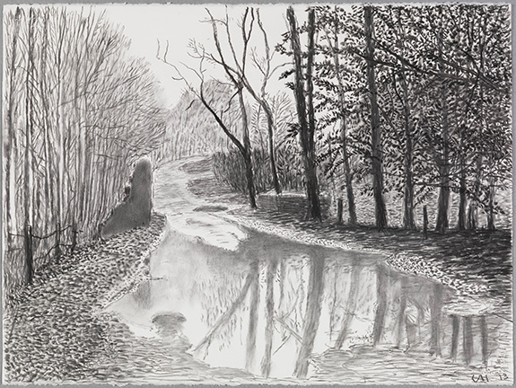 Là sont exposées ses dernières œuvres, qui datent de 2012 et de janvier 2013. Une grande salle de portraits : des proches à lui tous assis sur des chaises dans des poses ordinaires, couleurs très vives, visages peu expressifs. L’autre salle est consacrée aux vues depuis sa fenêtre faites en Angleterre très récemment, de sous-bois, de forêts et d’étangs hivernaux, beaux dessins à la mine de plomb, qu’il s’amuse ensuite à photographier et à reproduire en quatre fois leur taille. Salle un peu triste où domine le noir et blanc. Puis vient une multi-video, réalisée avec dix-huit caméras, montrant des gens qui jonglent et se lancent des balles, couleurs vives, musique : cela fait l’attraction de l’expo. Dernière salle : « The Great Wall ». Hockney a voulu montrer que, selon lui, tous les grands peintres à partir d’une certaine époque ont utilisé des appareils d’optique afin d’obtenir un réalisme toujours plus photographique. Il pense avoir fait là une découverte capitale… Il situe en 1420 ce moment charnière. Je quitte cette exposition avec un sentiment de perplexité. A la sortie, comme je demande à une dame de la sécurité la manière de trouver un bus le plus près possible pour rentrer, elle me fait une longue et magnifique démonstration de comment atteindre la station la plus proche (sur Fulton street), articulant bien les mots et les mimant gestes à l’appui. Le « Five » arrive et longe tout Fulton et McAllister. Je descends au coin de Jones et de Market, voulant rejoindre l’hôtel par Jones. Je me retrouve dans un de ces quartiers pauvres, dont les villes américaines ont le secret et qu’elles cachent souvent sous les ors rutilants des grandes rues commerçantes, mais il suffit de faire un pas de côté pour atteindre ces zones d’errance et de désespoir, là où des Afro-américains et des hispanophones en exil cherchent de quoi s’alimenter au fond des poubelles et trainent de crasseux caddies plein à ras bord de déchets et de sacs en plastique.
