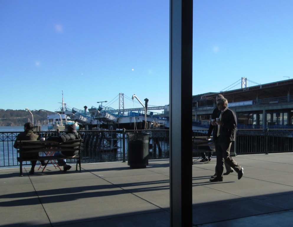 Mon premier jour de balade : aller à pieds jusqu’à Ferry Building, là, regarder les ferries qui débarquent de Sausalito, en face, ou d’Oakland, café expresso pris à l’intérieur du bâtiment, face à une grande baie vitrée, grande table en bois où viennent s’asseoir les passagers en partance, journal à la librairie du quai (The Passage), The New York Times, élections indiennes, révoltes en Ukraine. Comme le soleil chauffe de plus en plus, je sors me mettre sur un banc. Deux hommes âgés d’origine asiatique discutent sur un autre banc, à droite le Bay Bridge. Reprise de Market Street, dans l’autre sens, renseignements pour louer un vélo. Cher. Bus : depuis le coin de Kearny, bus 30, qui déroule tout Stockton, passe sous le tunnel, arrive en plein quartier chinois. En un instant, le véhicule est noir de monde, des habitants du quartier qui font leurs courses, branches de légumes qui dépassent des paniers, piaillements et rires en chinois de Canton. Puis Broadway, puis Colombus + Green. Descente. Quartier italien. Caffé Greco, Mona Lisa. Trottoir d’en face : le café Tosca, qui n’ouvre que le soir. Un peu plus bas : City Lights, la grande librairie militante. La Beat Generation toujours en vitrine : Kerouac, Ferlinghetti, Ginsberg, Snyder… Incursion vers l’intérieur. Toutes les dernières nouveautés au rez-de-chaussée, mais mélangées, l’écologie voisine la calculabilité, Turing avec Amartya Sen (dernier livre de Drèze et Sen sur l’état actuel de la confédération indienne, à lire probablement… un jour où on aura le temps). Le livre sur la calculabilité (édité à MITPress) cite mon ancien professeur, Daniel Lacombe. Me rappelle des souvenirs… des bons, des d’avant 68. Daniel Lacombe s’était affronté aux CRS, je m’en souviens. Je monte au premier étage : c’est le coin des poètes. Comme l’an dernier, je suis émerveillé de toute la production poétique américaine. Montre un réel engouement pour la poésie. Je trouve même une anthologie de la poésie française du XXème siècle en édition bilingue. Lire Jacottet, Bonnefoy et Dupin en anglais… C’est en vain que je chercherais à Paris la réciproque : une anthologie bilingue de la poésie américaine contemporaine. Il existe bien chez Penguin une très bonne anthologie, mais en anglais seulement. Quel travail ce serait de la traduire ! Autre surprise : on vient de publier une sélection de poèmes de Reverdy traduits en anglais ! Lire un de ses poètes préférés dans une autre langue : quelle curieuse sensation… on se rend compte alors que c’est un tout autre poète. Définitivement, la traduction crée d’autres œuvres, elle ne les transpose pas d’une langue vers l’autre. Mais ils qualifient Reverdy de « poète cubiste », cela me paraît absurde. ‘Cubiste » avait été donné par dérision à Picasso et Braque, parce que les critiques d’art de l’époque ne voyaient que des « petits cubes ». Il n’y a guère de raison d’en affubler un poète.