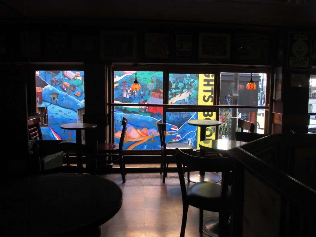 Le soir, après avoir retrouvé C. à la sortie Sud du Moscone Center, nous reprenons le 30, pour retourner vers North Beach. La nuit tombée, les façades des bistrots se sont illuminées, le Tosca a ouvert, ainsi que l’Adler ‘s museum, en réalité un bouge antédiluvien qui contient lui aussi des souvenirs de la grande époque. Au Vésuvio (la serveuse a changé entre temps) nous prenons un verre de blanc. A la table d’à côté un incroyable personnage, en redingote et chapeau haut-de-forme, petites lunettes noires et rondes, gants noirs couvrant des mains effilées, buvant bière sur bière et commandant à la patronne d’une voix d’outre-tombe… Nous mangeons chez Franchino des linguines et pennes parfaites. La petite famille n’arrête pas de discuter dans la langue de leur pays, la serveuse s’appelle Franca, le patron porte une casquette et salue ses clients avec une belle humeur. Le 30 sert encore de bus de retour.